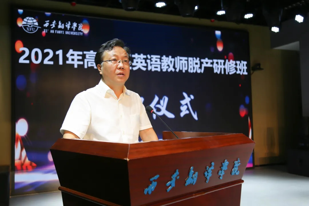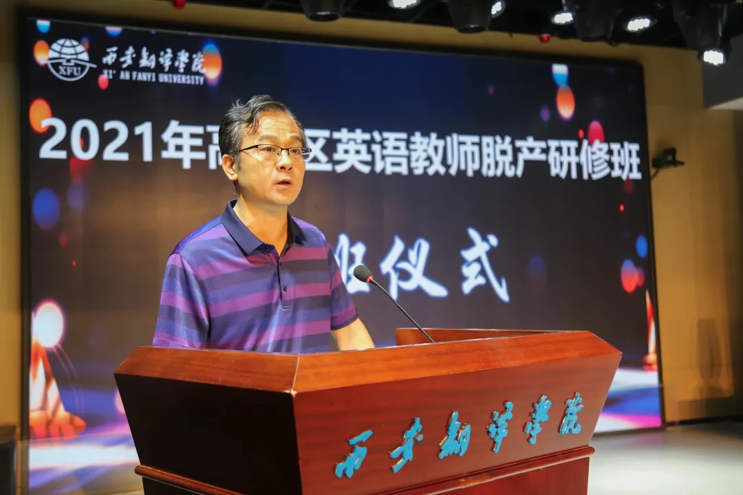 2021年7月26日上午,由西安市高陵区教育局主办,西安市高陵区教师进修学校、西安翻译学院承办的 2021 年高陵区中学英语教师脱产研修班,在西安翻译学院西区体验式教学中心报告厅举行了开班仪式。西安翻译学院党委副书记、副校长郭炜,高陵区教育局人事科科长左炜,西安翻译学院继续教育学院副院长刘远征,西安翻译学院培训学院培训科科长张乐,以及来自高陵区中学55名英语骨干教师参加了开班仪式。