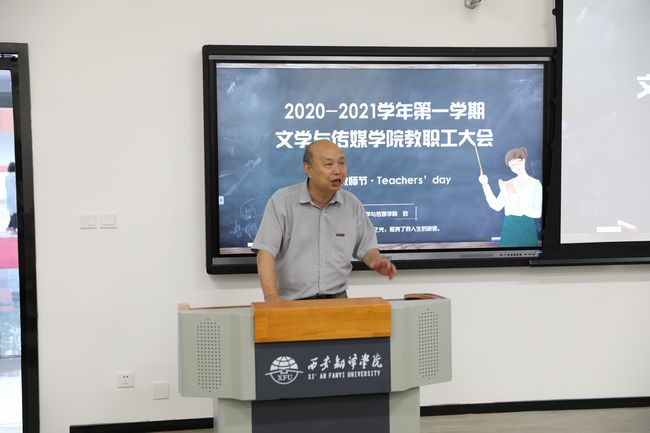 9月9日下午,文传院于十号教学楼10T11教室召开新学期第一次教职工大会。副院长李绍先主持会议。