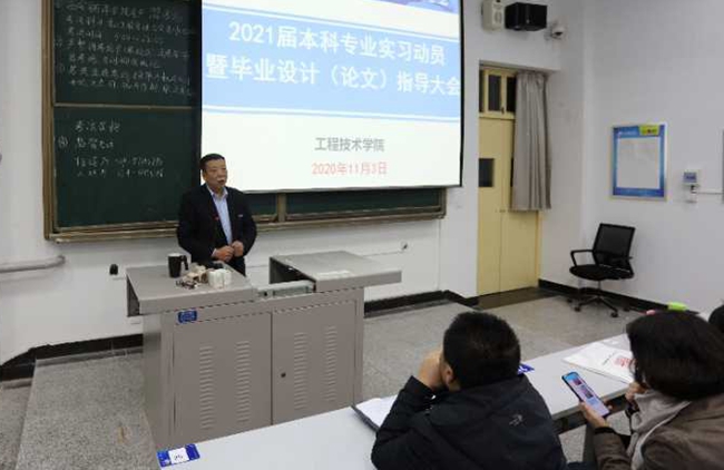 11月3日晚,工程技术学院2021届本科专业实习动员暨毕业设计(论文)指导会在732T教室成功举办。工程技术学院副院长支侃买、赵桢宇,电子科学系主任梁计锋、工程管理系主任宋虹桥、专业负责人王振辉、尤国强、张新新、侯红、李丽及辅导员张燕芳参加会议。