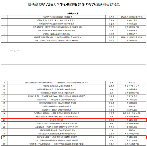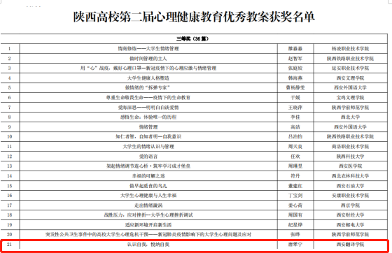 在陕西高校第二届心理健康教育优秀教案评选活动中,我校唐翠宁老师作品《认识自我 悦纳自我》获得三等奖;在第六届大学生心理健康教育优秀咨询案例评选活动中,谢晓欣老师作品《告别过去 拥抱未来》、刘联军老师作品《一例家庭暴力影响下大学生情感冷漠与唤醒的个案报告》均获三等奖;我校两名学生在陕西高校大学生“心相遇 爱同行—心理健康教育伴我成长”主题征文活动中分别获得二等奖和三等奖。