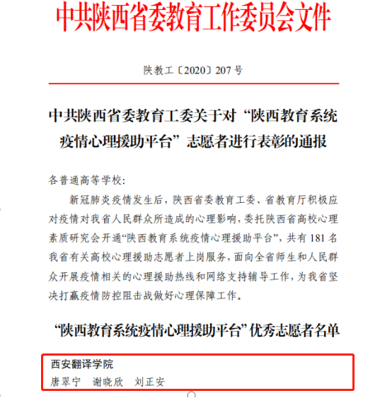 我校大学生心理健康教育与咨询中心唐翠宁、谢晓欣、刘正安三位教师因积极参与全省疫情相关的心理援助热线和网络支持工作,被陕西省委教育工委评为“陕西教育系统疫情心理援助平台”优秀志愿者。