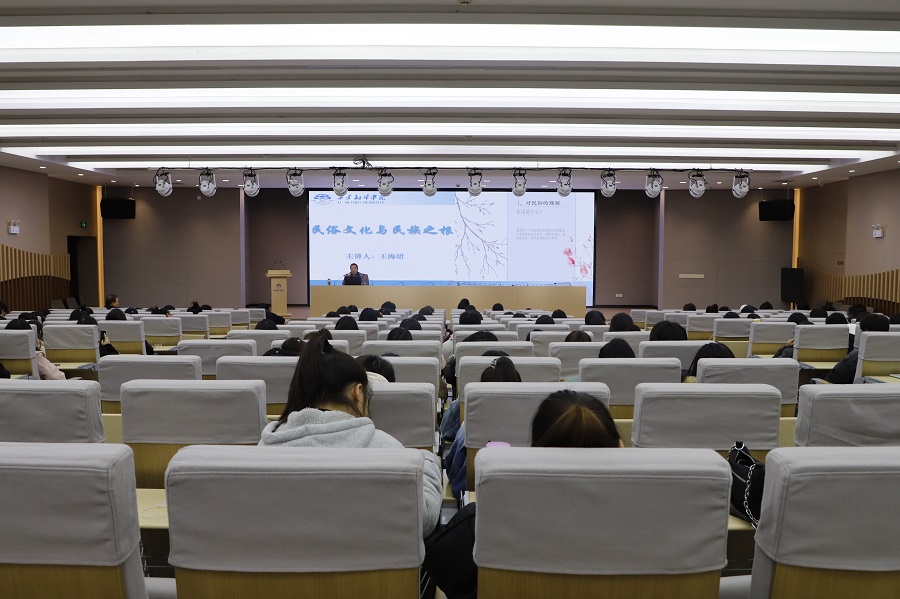 王海珺围绕“民俗文化与民族之根”这一主题,细致解读了民俗文化的内涵与历史进程。在阐释民俗文化程式化、象征性、集体性等六大特征后,他结合生活实际讲述了民俗文化投射于中国原始神话中的艺术形式,并从宗教图腾、原始彩陶等方面深入浅出地呈现出民间生殖崇拜的思想。王海珺用幽默风趣的讲解方式,带领现场师生共同探讨民族文化,鼓励大家积极学习和研究民俗文化,探索民俗之根。