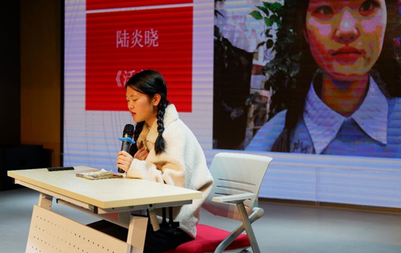 会上,同学们用心地分享自己对《红楼梦》《活着》《贫穷的本质》《了不起的盖茨比》《A STREET CAT NAMED BOB》等国内外著作的读书心得,大家都沉浸在阅读的世界里。