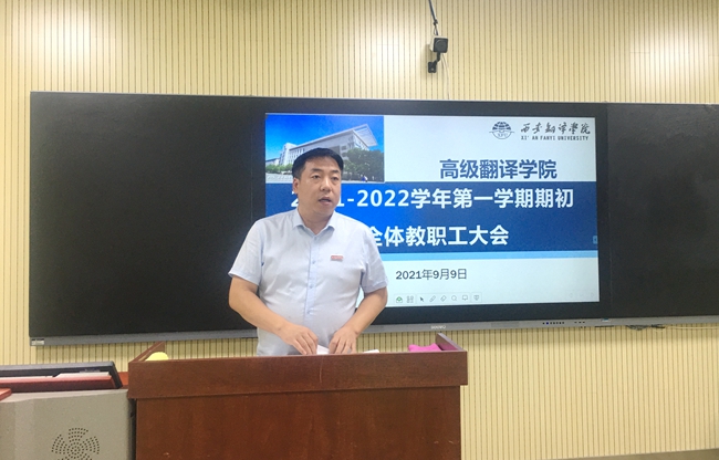 袁小陆部署了新学期学院重点工作。他围绕学院迎接国家级一流专业建设评估的整体思路,从学科建设、人才培养、师资队伍等方面展开阐述。他表示,学科建设应围绕学科带头人来建设学科、建设重点研究方向;在人才培养上,学院教师需承担双重任务。希望全体教职工结合学院实际,根据日常工作中遇到的问题,思考在终南山下、太乙河畔如何打造具有西译特色的翻译专业,培养高层次翻译人才。