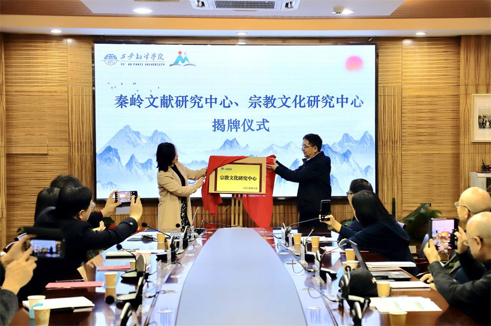 我校科研处副处长张莹宣读秦岭文献研究中心、宗教文化研究中心成立文件。王利晓、李浩共同为两个中心揭牌。