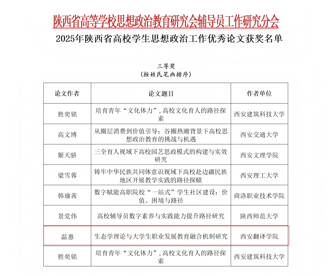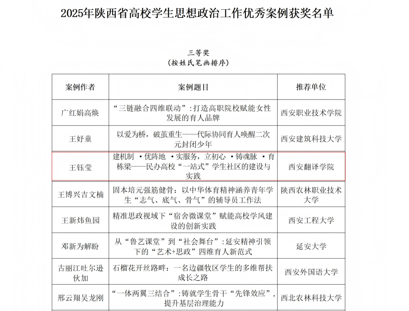 近日,2025年“陕西省高校学生思想政治工作研究论文与工作案例”评选结果正式揭晓。西安翻译学院辅导员团队凭借扎实的研究功底与鲜活的实践探索,在本次评选中脱颖而出,共荣获三项省级奖项,获奖数量位居全省民办高校首位,充分展现了我校思想政治工作的创新活力与育人实效。