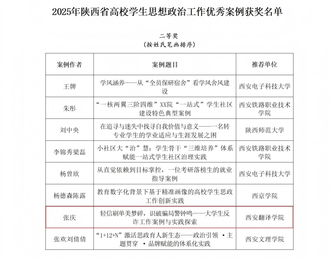 本次评选由陕西省高等学校思想政治教育研究会辅导员工作研究分会组织,面向全省高校开展,共评选出优秀论文60篇、优秀案例67篇。我校在理论研究与实践应用两个维度均取得突破,获奖成果涵盖学生职业发展、反诈教育、社区建设等多个思政前沿领域。其中,张庆老师的《轻信刷单美梦碎,识破骗局警钟鸣——大学生反诈工作案例与实践探索》和王钰莹老师的《建机制·优阵地·实服务,立初心·铸魂脉·育栋梁——民办高校“一站式”学生社区的建设与实践》分别荣获优秀案例二等奖和三等奖,温惠老师的《生态学理论与大学生职业发展教育融合机制研究》荣获优秀论文三等奖。