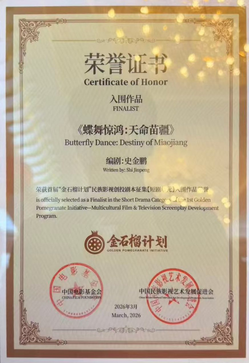 首届“金石榴计划”民族影视创投会由中国电影基金会、中国民族影视艺术发展促进会共同指导,旨在挖掘和扶持优秀民族影视人才与创作项目,以光影艺术讲好中华民族共同体故事。活动共收到来自全国各地的200余部民族影视剧本,涵盖电影、短剧等多种形式,评审标准严格、专业度高、竞争异常激烈。经过多轮筛选与专业评审,我校艺术系学生组成的天命苗疆创作团队,其作品凭借鲜明的民族文化特色与扎实的剧本创作功底成功脱颖而出,顺利荣获短剧单元入围奖项。