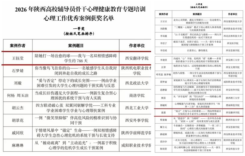 近日,陕西省高等学校思想政治教育研究会辅导员工作研究分会正式公布2026年陕西高校辅导员骨干心理健康教育专题培训心理工作案例征集活动评选结果。我校人文与艺术学部辅导员王钰莹、温惠凭借扎实的心理育人实践功底、专业的案例研判与撰写能力,在全省众多参评选手中脱颖而出,分别荣获一等奖、三等奖,充分彰显了我校辅导员队伍精湛的心理健康教育业务能力与过硬的专业综合素养。
