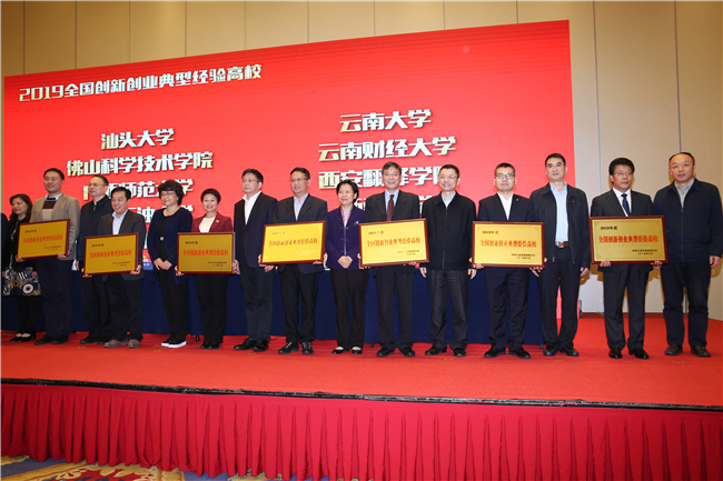 校长韩江水领取“2019年全国创新创业典型经验高校”奖牌