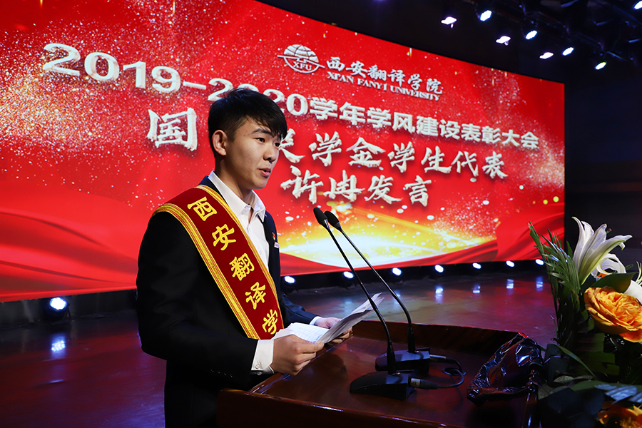 在与会师生奏唱国歌之后,齐玉水宣读了《西安翻译学院关于表彰2019-2020学年学风建设先进集体和先进个人的决定》。文件表彰决定授予181110107班等49个班级为2019-2020学年“先进班集体”荣誉称号;授予191110501班等173个班级为2019-2020学年“优良学风班”荣誉称号;授予东一公寓117室等150个宿舍“文明宿舍”荣誉称号;授予许冉等30名同学“国家奖学金”;授予文婷等553名同学“国家励志奖学金”;授予姚天乐等10名同学“利民奖学金”;授予董凡等83名同学“学校一等奖学金”;授予李诗宇等328名同学“学校二等奖学金”;授予冯乐等621名同学“学校三等奖学金”;授予陈佳雨等754名同学“优秀学生干部”荣誉称号;授予张涛等8 名同学“创新之星”荣誉称号;授予杨召玉等 8 名同学“创业之星”荣誉称号;授予西安市梓亦凡广告有限公司等 4 个团队“优秀创业团队”荣誉称号;授予陈晓楠等 28 名同志“先进工作者”荣誉称号。学校希望受表彰的集体和个人珍惜荣誉、谦虚谨慎、再接再厉,在学校优良学风建设活动中发挥模范带头作用,再创佳绩。同时,号召全体师生以受表彰的集体和个人为榜样,学习他们顽强拼搏、勇争一流的精神,进一步奋发图强、刻苦钻研、追求卓越、团结协作,不断提高自身素质和能力,为全力推动学校内涵建设的高质量发展贡献力量。