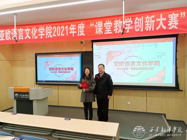 为有效推进“四个回归”,提高教师教育教学能力,促进教师综合素质、专业化水平和创新能力的全面提升,11月12日,亚欧语言文化学院举行“2021年度课堂教学创新大赛”决赛。本次大赛邀请西安外国语大学英文学院院长、陕西省高等学校专业设置与教学指导委员会外国语言文学类工作委员会(以下简称外语教指委)委员南健翀,西北工业大学外国语学院副院长、外语教指委委员张奕,西北政法大学外国语学院原院长、外语教指委委员马庆林,西安翻译学院副校长樊相宇,亚欧语言文化学院院长兼外语教指委副主任委员李庆明担任大赛评委。大赛由亚欧语言文化学院教学副院长吴震主持。
