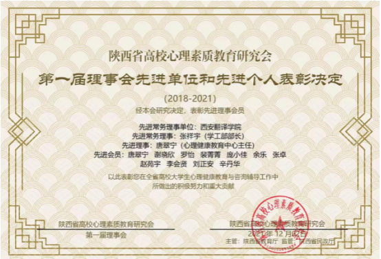 同时,我校在陕西省高校心理素质教育研究会第一届理事会先进单位与个人表彰中亦荣获嘉奖。西安翻译学院被评为先进常务理事单位,学工部部长张祥宇荣获先进常务理事称号,心理咨询中心主任唐翠宁荣获先进理事称号,我校专兼职心理咨询师谢晓欣、罗怡、裴菁菁、庞小佳、余乐、张卓、赵苑宇、李会贤、刘正安、辛丹华等老师荣获先进会员称号。