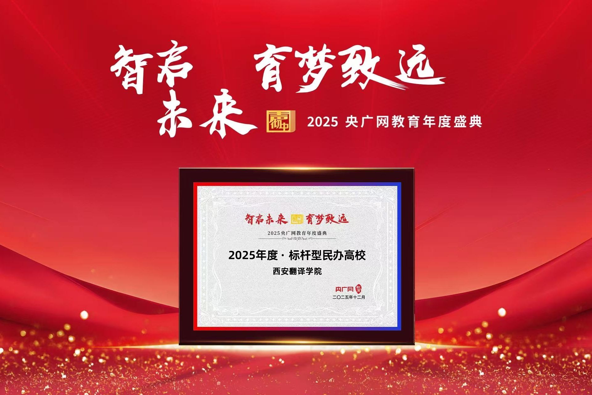 12月26日,2025“声彻中国”央广网教育年度盛典在北京隆重举行。本届盛典以“智启未来 育梦致远”为主题,汇聚教育界专家学者、院校代表及行业领军人物,共同探讨“十五五”时期教育高质量发展路径。在盛典发布的年度教育荣誉评选中,西安翻译学院凭借其鲜明的办学特色、扎实的育人成果和广泛的社会影响力,荣获2025年度“标杆型民办高校”称号。