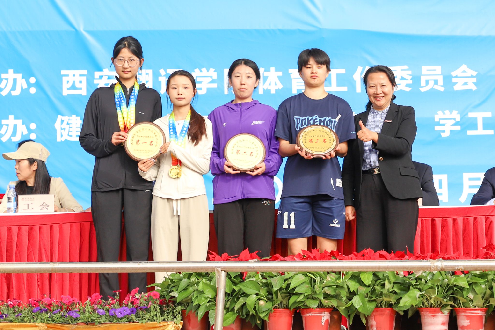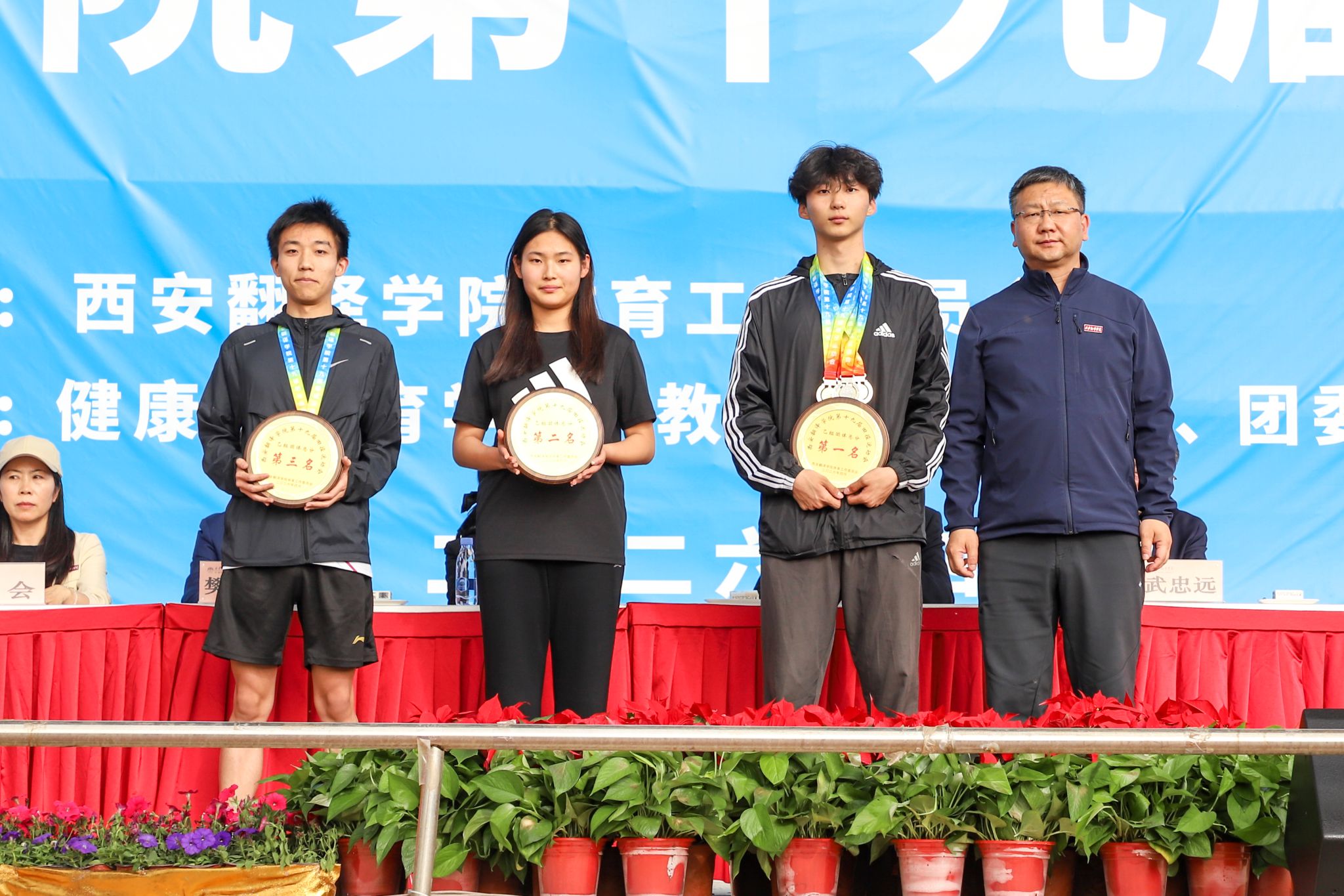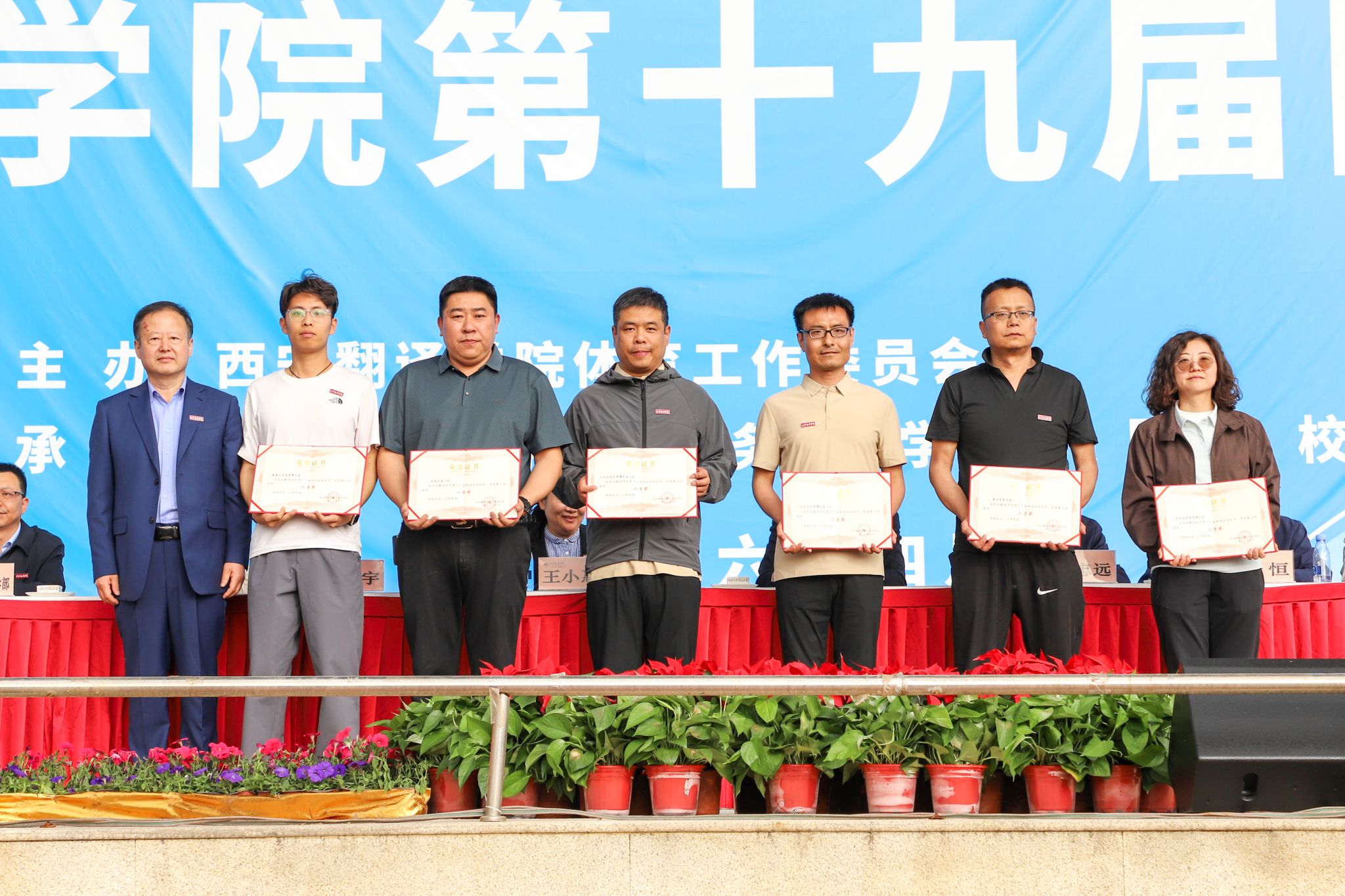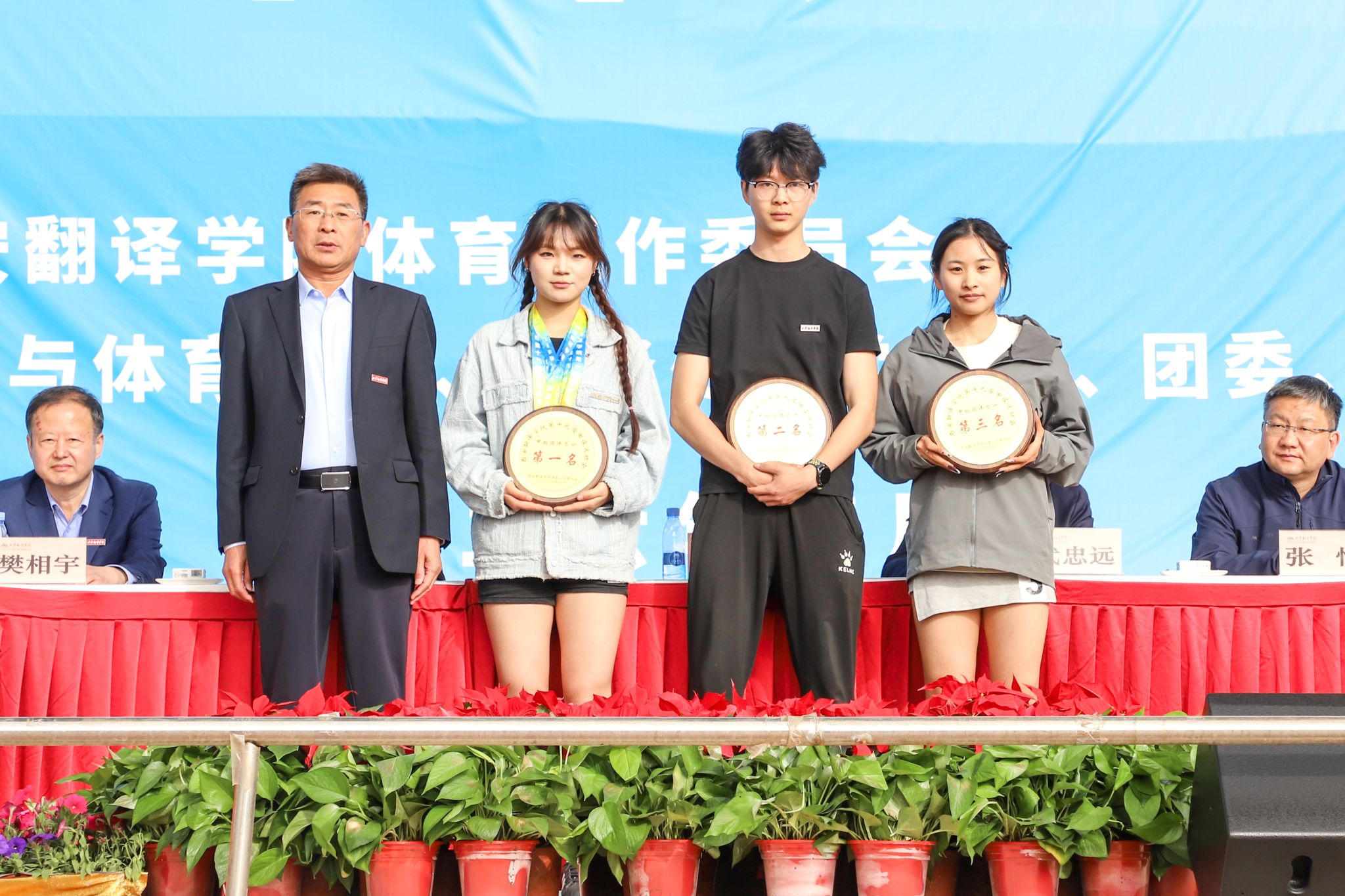 校领导为获奖运动员及团体颁奖,并合影留念。
