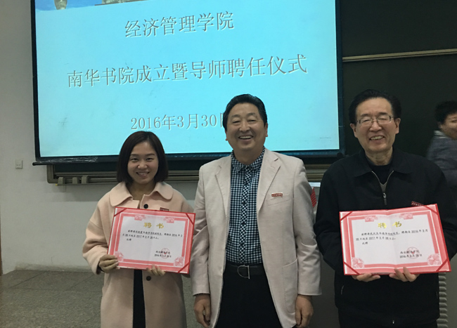 齐院长(中)为南华书院院长及副院长颁发聘书