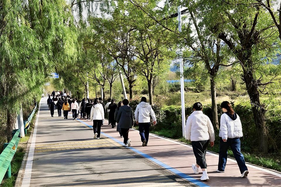 栾宏鸣枪发令,健步走活动正式拉开帷幕。教职工们在校领导的带领下,步伐坚定、意气风发地踏上征程。大家行走在初冬的终南山畔,寒风轻拂却热情不减。或驻足欣赏山间初冬的独特景致,或分享工作与生活中的点滴,欢声笑语在山间回荡,展现出我校教职工积极向上、团结协作的精神风貌。