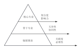 专业集群内部由不同专业组成,专业不是随意组合,而是通过专业集群建设,进一步加强专业建设与发展,优化专业设置,提升人才培养质量,更好地服务于同一行业发展,满足社会需求。因此专业集群内部的专业要分为核心专业、骨干专业、辐射专业三个层次,核心专业的遴选主要考虑契合度和影响力两个因素。契合度主要是指与学校发展目标、建群方式、产业链条中的关键环节等方面的契合度,充分考虑专业的发展性和前瞻性。影响力主要是指校内对其他专业的影响力,校外对区域经济发展的促进作用,核心专业是集群建设的“龙头”,要能够带动整个专业集群内部其他专业的发展。骨干专业的遴选主要考虑互补性和协同性。互补性主要是指与核心专业知识的互补,让不同专业之间进行知识交流和碰撞,共生融合,相互促进,优势互补。同时通过骨干专业,进一步扩大服务产业链条的长度,更好地服务于产业链条的重点环节。协同度主要是指技术和知识协同,现代产业链对人才的需求往往是应用型和复合型人才,骨干专业要通过课程体系、实训过程、资源共享等方式与核心专业进行协同育人,培养学生具有专业核心能力以及通用和关联能力,从而满足产业链岗位群的能力需求。辐射专业的遴选主要考虑关联度和必要性。关联度主要考虑辐射专业的课程体系、师资力量、培养目标能够能否与核心专业、骨干专业进行关联。必要性主要考虑辐射专业是否能够与核心专业、骨干专业进行知识的补充,能够增强其专业育人或产业链的服务效果(如图2所示)。