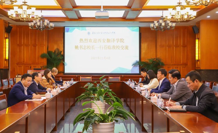 11月4日,调研团队继续前往广东外语外贸大学南国商学院进行交流。校长王华、副校长王铭玉分别就民办院校转型挑战、外语专业重构与小语种建设等议题进行介绍。王铭玉提出,外语人才培养应超越工具性定位,构建“语言深度+专业盔甲+文化洞察力”三维竞争力。姚书志对此表示高度认同,并围绕西安翻译学院在外语学科建设中面临的现实问题,与对方进行了富有建设性的对话。