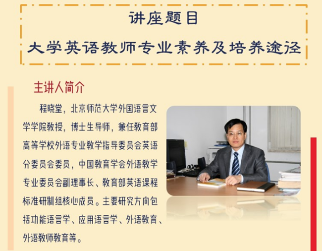 5月19日,北京师范大学外国语言文学学院教授程晓堂应邀为英文学院教师作题为“高校英语教师专业素养及培养途径”学术讲座。英文学院院长王文、副院长李鲜花以及全体专职教师以线上与线下相结合的方式参加讲座。讲座中,程教授从语言教学基本理论知识概念出发,通过语言学习的四个典型案例,强调了语篇教学的多维分析、语言内容背...